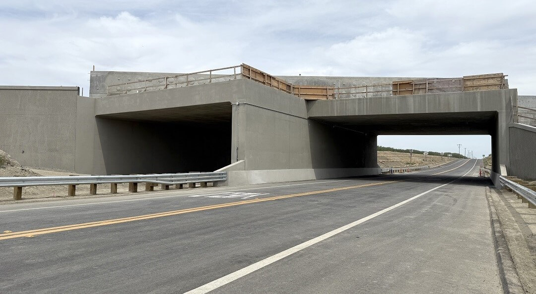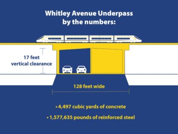 The underpass is more than 128 feet wide and provides 17 feet of vertical clearance. The structure is comprised of 4,497 cubic yards of concrete and 1,577,635 pounds of reinforced steel.