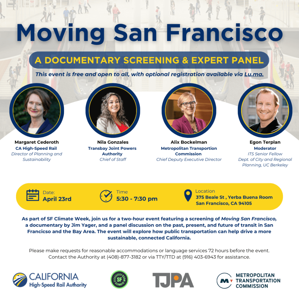 Como parte de la Semana del Clima de San Francisco, únase a nosotros en un evento de dos horas que incluye la proyección de Mudanza a San Francisco, un documental de Jim Yager y una mesa redonda sobre el pasado, el presente y el futuro del transporte público en San Francisco y el Área de la Bahía. El evento explorará cómo el transporte público puede impulsar una California sostenible y conectada.