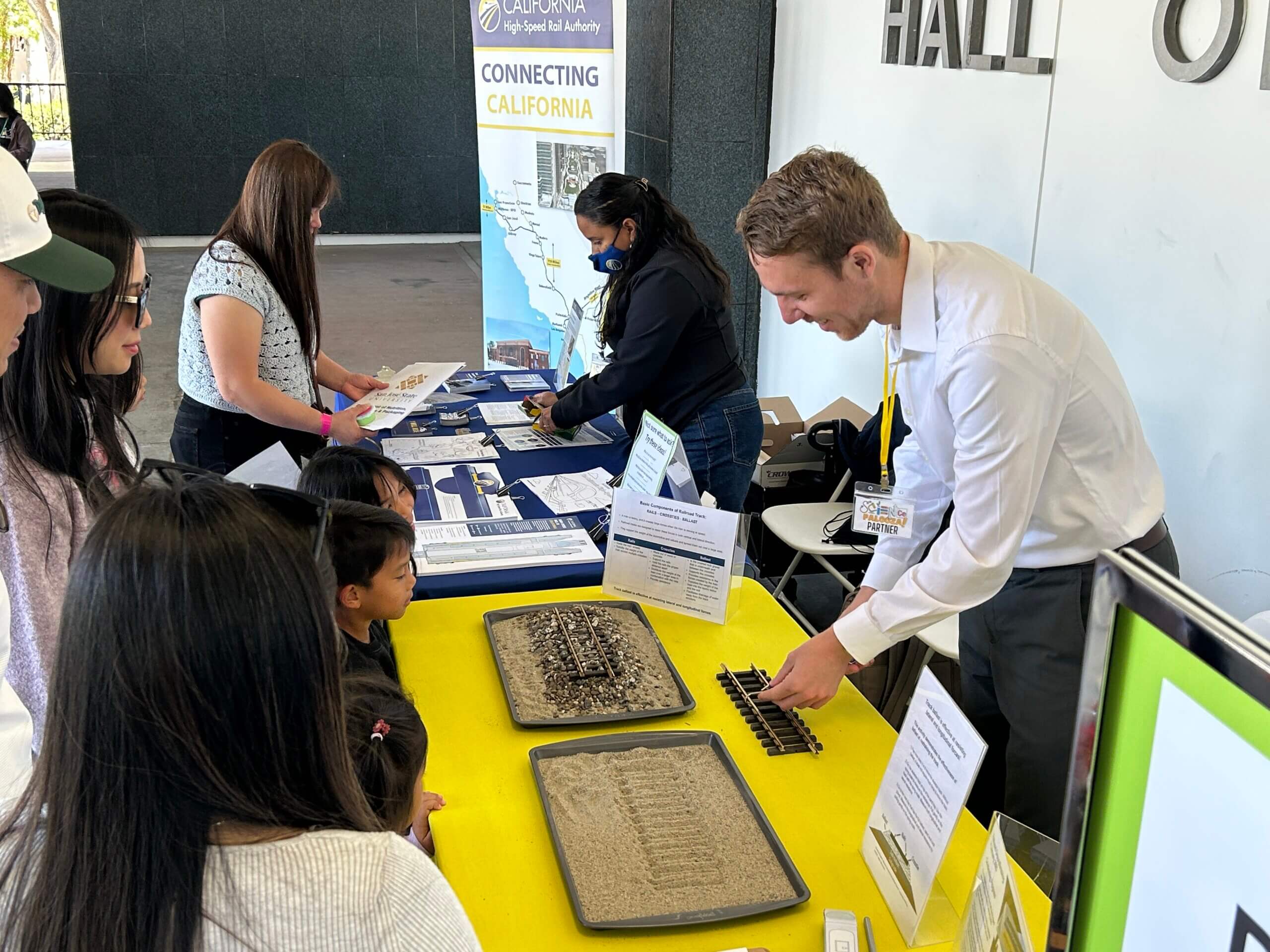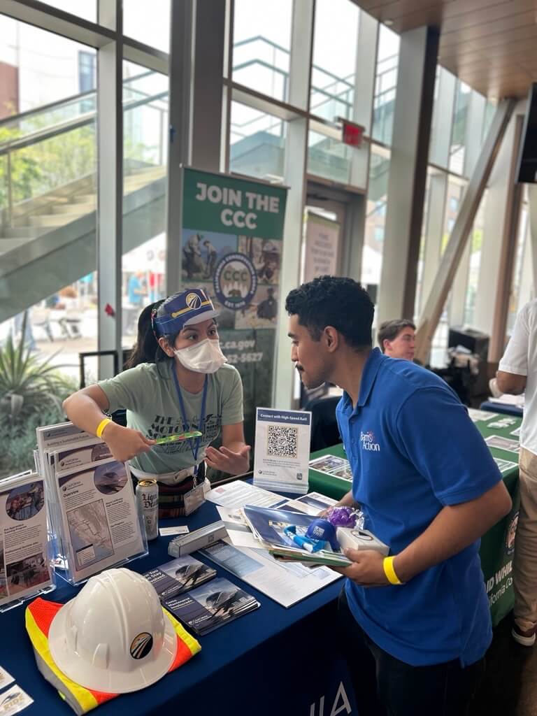 この夏、ロサンゼルス公共図書館で開催されたジョブフェアで、SoCalチームはカリフォルニア州の高速鉄道プロジェクトについて知りたいという50人以上の求職者と交流しました。当局職員はプロジェクトの進捗状況を報告するとともに、熟練工を目指す人々のためのキャリアパスや機会について話し合いました。当局はセントラルバレー・プレアプレンティスシップ・トレーニング・プログラムを通じて利用可能な機会についても共有し、参加者は高速鉄道における将来のキャリア機会について学ぶことに熱意を燃やし、キャリアパスについて多くの質問をしました。このイベントは参加者の熱意を高め、地域社会がプロジェクトについて、そして州の交通環境における歴史的な変革の一翼を担うための準備方法についてより深く理解するきっかけとなりました。